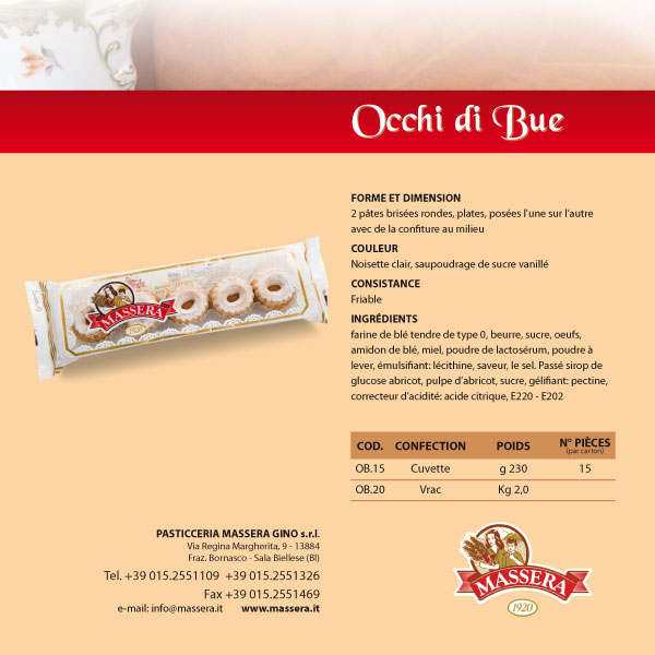 Farine de blé tendre de type 0, beurre, sucre, oeufs, amidon de blé, miel, poudre de lactosérum, poudre à lever, émulsifiant: lécithine, saveur, le sel. Passé sirop de glucose abricot, pulpe d’abricot, sucre, gélifiant: pectine, correcteur d’acidité: acide citrique, E220 – E202